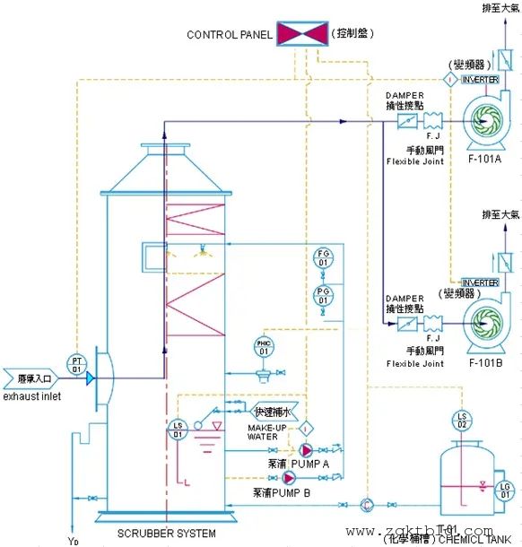2022-06-07 17:40:11 来源:枣强县润和环保设备有限公司 喷淋塔自控系统由液体存储箱、压力传感器、电磁阀和耐酸碱水泵,工人将调配好的吸收液倒入液体存储箱中,在需要向喷淋塔本体中加药时,控制系统控制耐酸碱水泵工作,将液体存储箱中的吸收液加入水箱中,水位上升,浮球带动活动块向上运动,然后控制系统控制电磁阀打开,水箱中进入喷淋管中并从喷淋头喷出,随着水箱中的吸收液减少,活动块向下运动,当水箱中的吸收液用尽时,活动块与压力传感器,压力传感器检测到压力并将信息传递给控制系统,然后控制系统再次控制耐酸碱水泵工作,且通过设置流量计,流量计用于显示已将向水箱中添加的吸收液的剂量,便于管理,解决了现有喷淋塔采用人工加药,浪费了工人时间且工人劳动强度大的问题。
