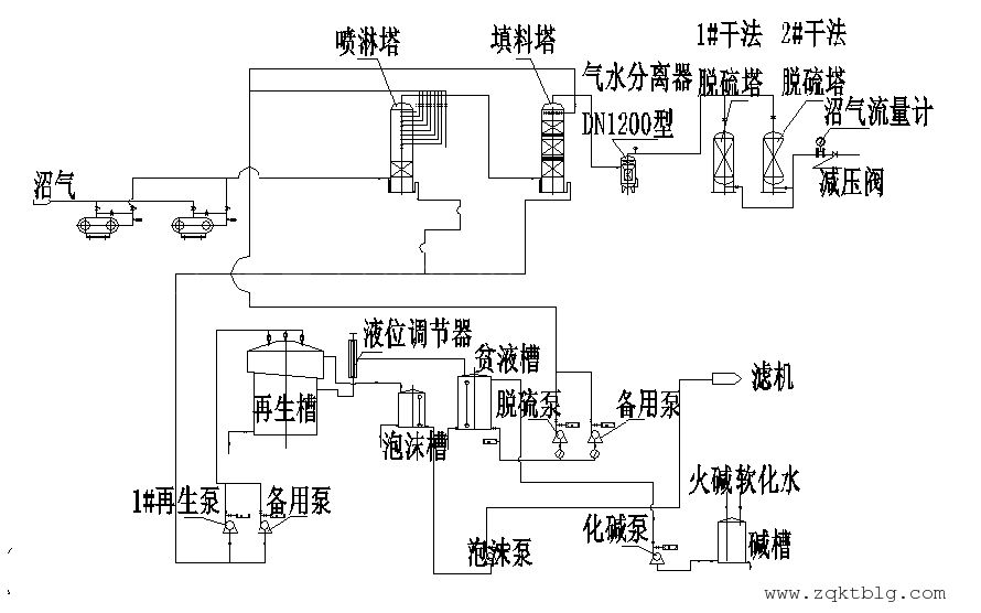 脱硫塔为气液逆向接触的填料吸收塔。含硫沼气从填料塔底部进入与从塔顶进入的碱性循环水 (贫液)在脱硫塔填料表面充分接触,硫化氢等硫化物与碱液发生化学反应,从而达到脱硫的目的。反应后的循环水 (富液)经脱硫塔底部进入到。